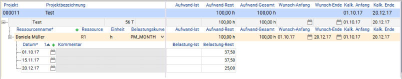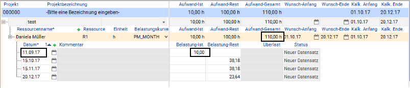 Grund: Die Belastungen werden auf Rastergranularität linearisiert, da die Speicherung nur die Gesamtaufwände etc. über den jeweiligen Zeitraum und die Anzahl betroffener Arbeitstage enthält. Überlasten werden daher auch nur auf Rastergranularität ausgewiesen. Es entsteht in einem Belastungssatz nur dann eine Überlast, wenn der Restaufwand die Verfügbarkeit im gesamten fraglichen Zeitraum übersteigt.