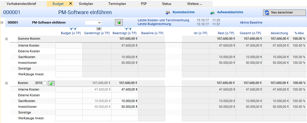 - Wera Heine betätigt die Schaltfläche Neu berechnen. Die Zahlen aus der Jahresscheibe Kosten 2018 werden auf die Projekt-Gesamt-Ebene verdichtet.
