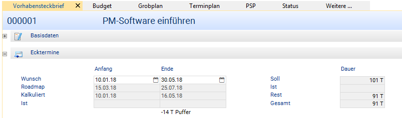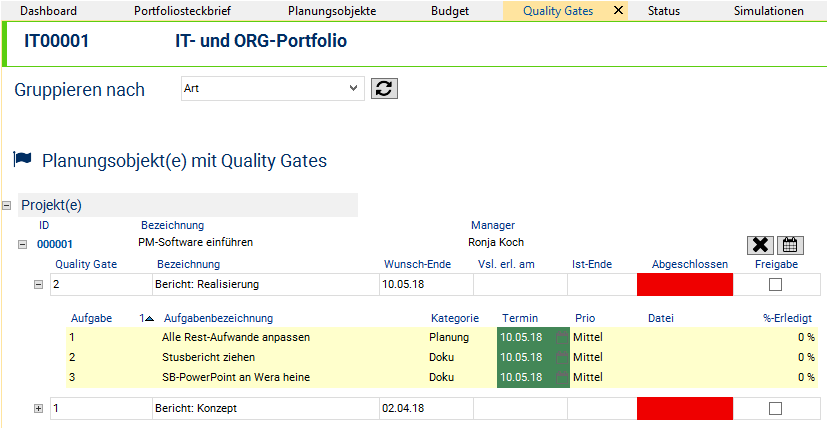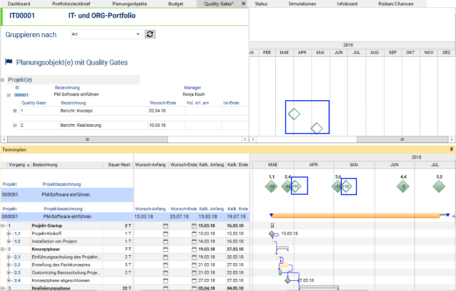 - Entsprechend den berechneten Terminen des Projekts setzt die Portfoliomanagerin die Termine für die Quality Gates im Feld Wunsch-Ende und führt die Kapazitätsrechnung im Modul Terminplan durch.