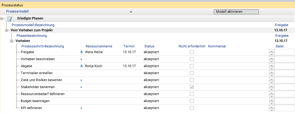- Der Status aller Prozessschritte wird dabei auf "akzeptiert" geändert und im Feld Freigabe wird das Datum der Freigabe von der Portfolimanagerin Wera Heine angezeigt.