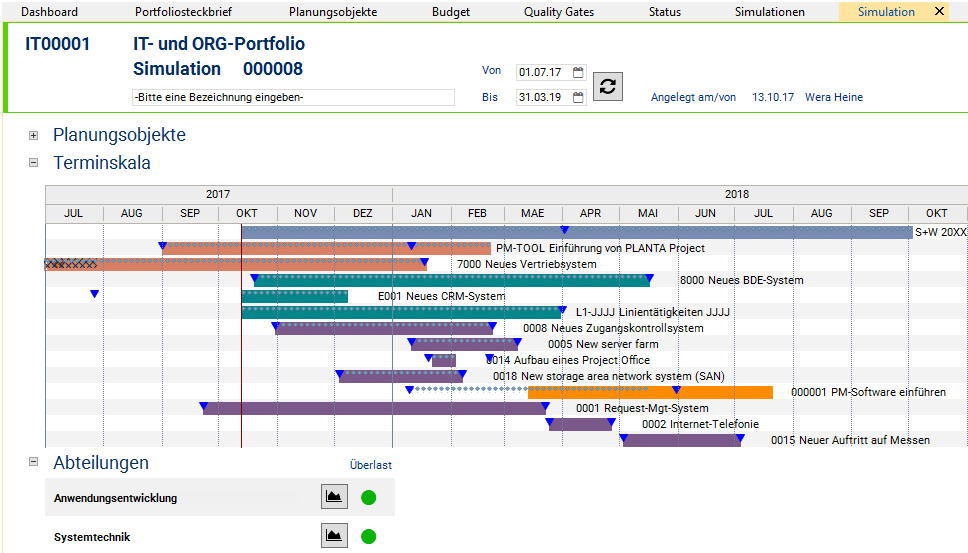 - Nach der Verschiebung der Termine sieht die Portfoliomanagerin an der Veränderung der Ampel von rot auf grün, dass die Überlast der Abteilung Systemtechnik verschwunden ist.