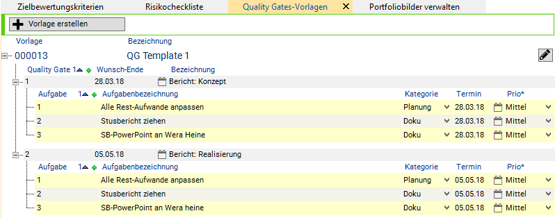 - Im Modul Quality Gates-Vorlagen werden Vorlagen erfasst, die in einzelnen Portfolios ausgewählt werden können und dann für alle Planungsobjekte des Portfolios gelten.