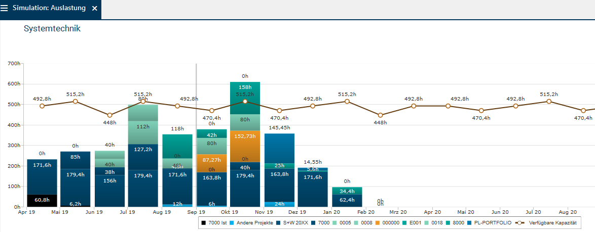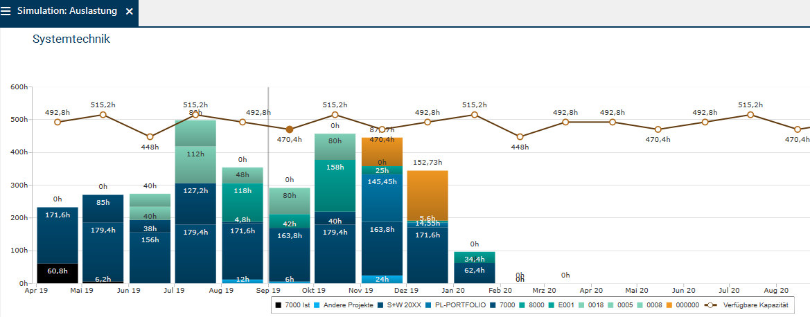 - Das Säulendiagramm stellt die Auslastung der Ressourcen der Abteilung Systemtechnik in allen Planungsobjekten dar.