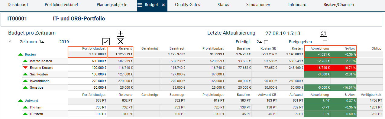- Die Maßnahmen von Wera Heine haben den gewünschten Erfolg. Das Relevante Budget bleibt 27.861 € unter dem Portfoliobudget. Dies wird durch die grüne Ampel auf den Abweichungsfeldern sofort ersichtlich.