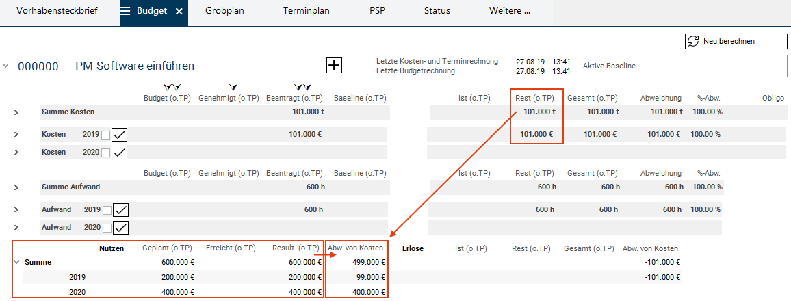 - Wera Heine betätigt die Schaltfläche Neu berechnen. Die Zahlen aus der Jahresscheibe Kosten 2019 werden auf die Projekt-Gesamt-Ebene verdichtet.