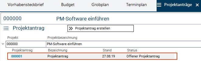 - Wera Heine betätigt den Link auf der ID des Vorhabens PM-Software einführen und öffnet so das Vorhaben-Panel.