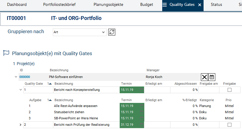 - Die Termine der Aufgaben stimmen mit den Terminen der Quality Gates überein und werden beim Einkopieren in ein Projekt erfasst. Sie können anschließend ebenfalls vom Portfoliomanager geändert werden.