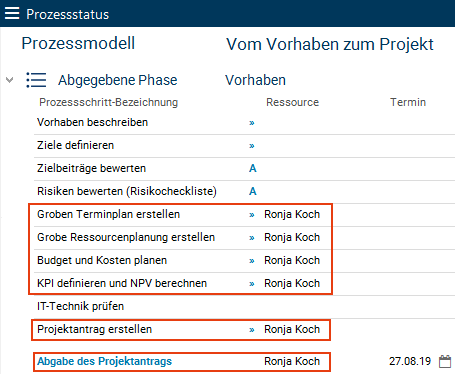 - Im Modul Prozessstatus klickt Wera Heine auf den Prozessschritt Freigabe zum Projekt.