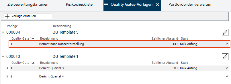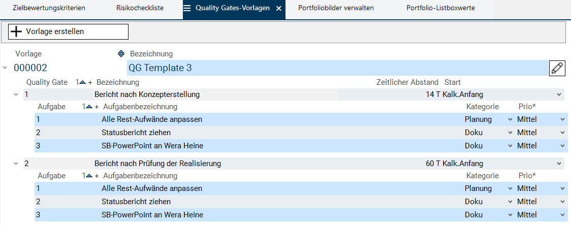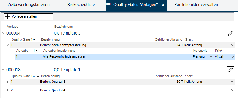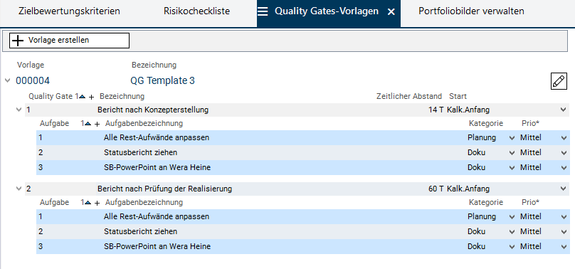 - Im Modul Quality Gates-Vorlagen werden Vorlagen erfasst, die in einzelnen Portfolios ausgewählt werden können und dann für alle Planungsobjekte dieser Portfolios gelten.