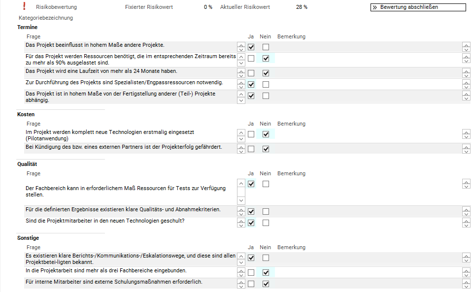 - Bereiche und Kategorien werden in diesem Modul nur ausgewählt und zur Gliederung von Risikofragen verwendet. Angelegt werden sie im Modul Portfolio-Listboxwerte.