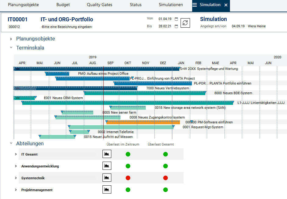 - Nach dem Verschieben der Termine (ggf. auch der Termine eines weiteren Planungsobjekts) sieht die Portfoliomanagerin an dem Wechsel der Ampel von rot auf grün, dass die Überlast der Abteilung Systemtechnik verschwunden ist.