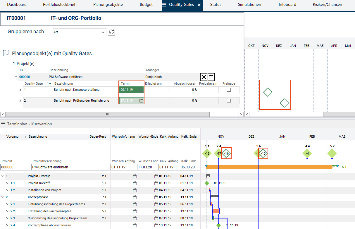 - Entsprechend den berechneten Terminen des Projekts bestimmt die Portfoliomanagerin die Termine für die Quality Gates im Feld Termin und führt erneut die Berechnung des Terminplans durch.