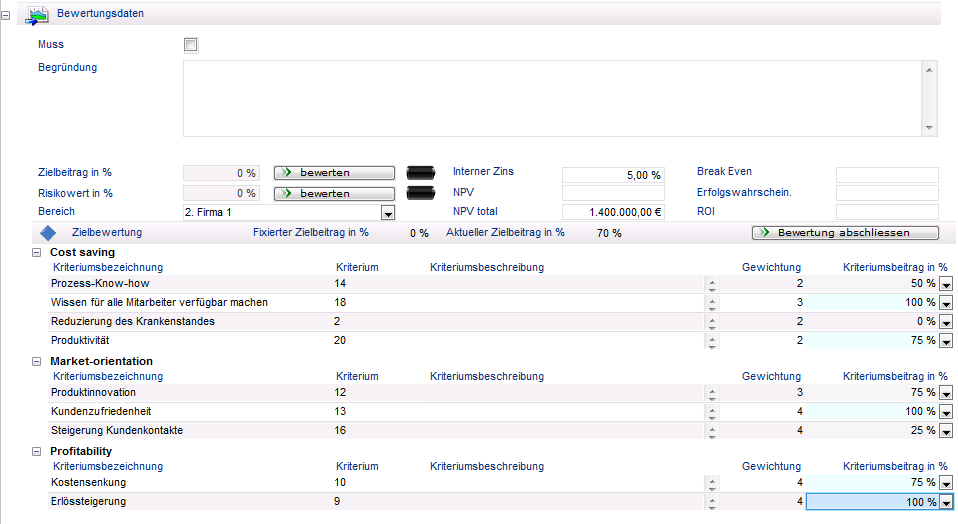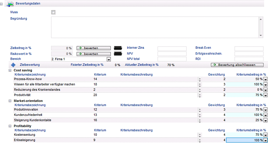 - Mit Hilfe von Bewertungskriterien schätzen Projektantragsteller die Erfolgsaussichten von Ideen, Vorhaben und Projekten im Unternehmen ein.