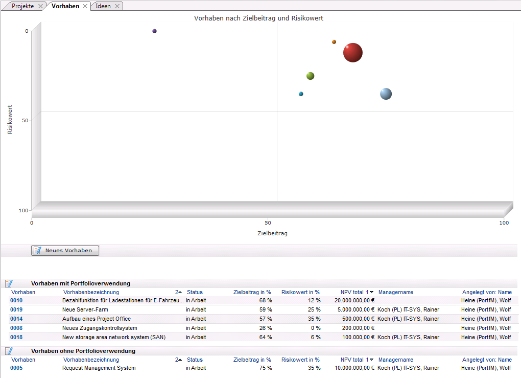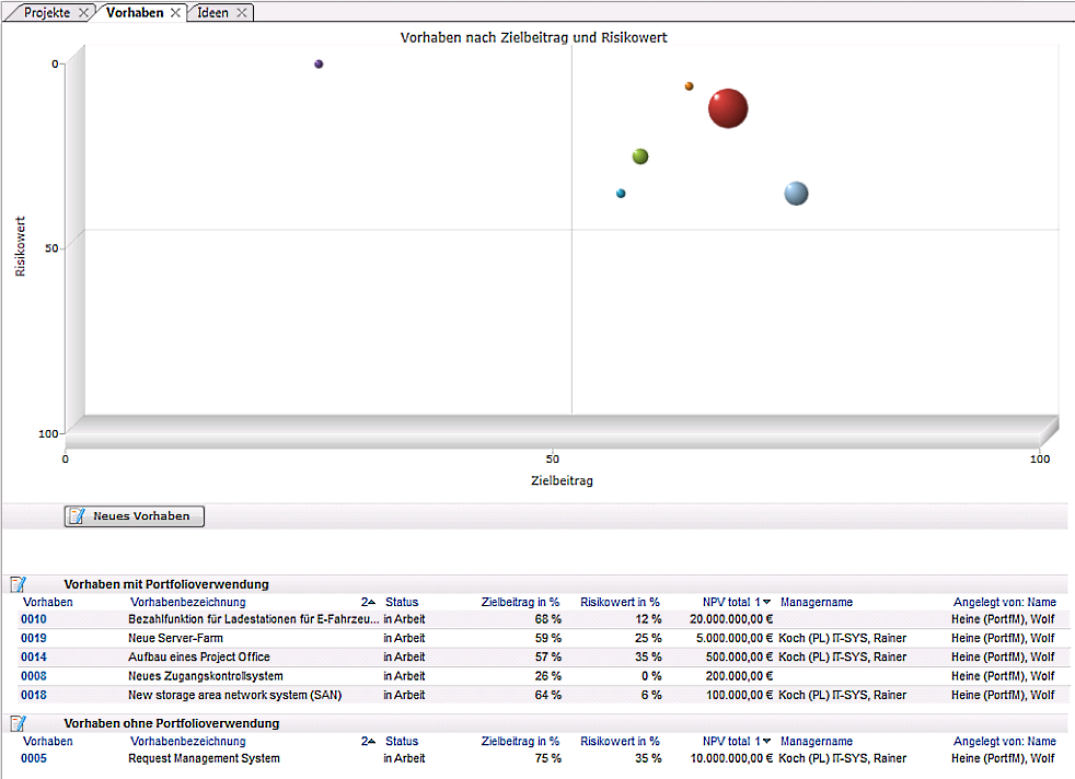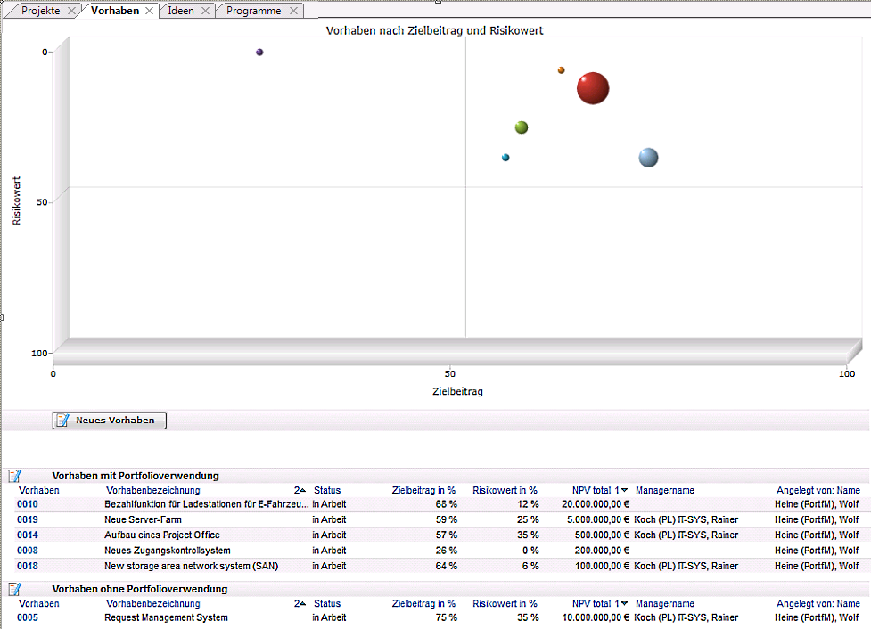 - Die Bewertung der aufgelisteten Vorhaben nach Zielbeitrag und Risikowert. Die Darstellung erfolgt in grafischer Form als Bubble Chart.