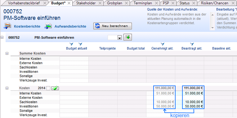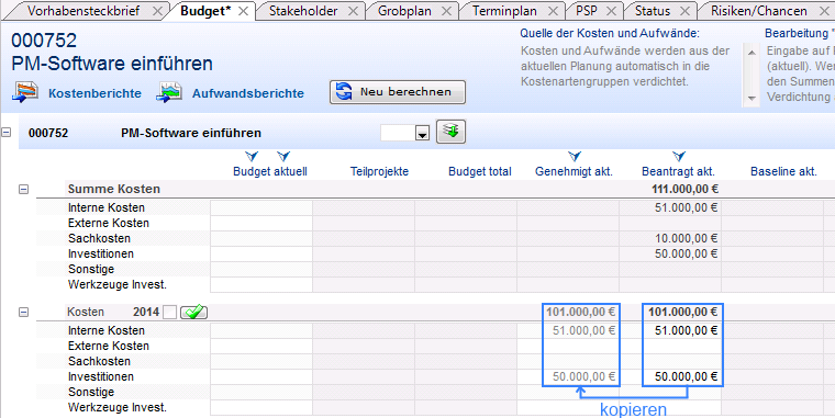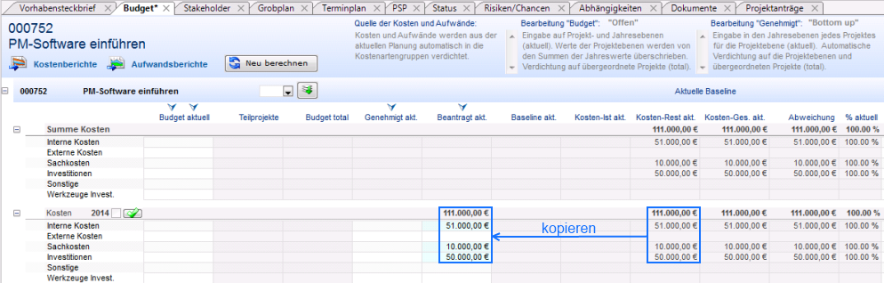 - Im Budgetzeitraum Kosten 2014 kopiert Wolf Heine die Kosten aus der Spalte Beantr. akt. in die Spalte Genehmigt akt.