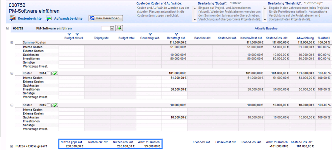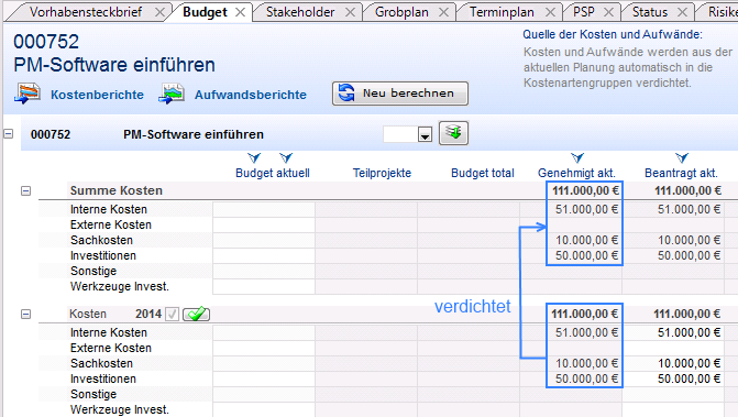 - Wolf Heine betätigt die Schaltfläche Neu berechnen. Die Zahlen aus der Jahresscheibe Kosten 2014 werden auf die Projekt-Gesamt-Ebene verdichtet.