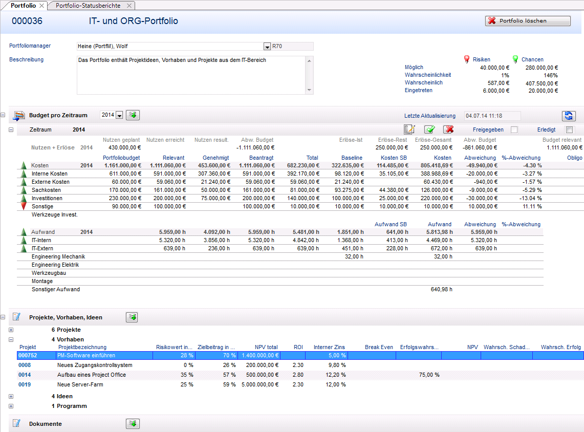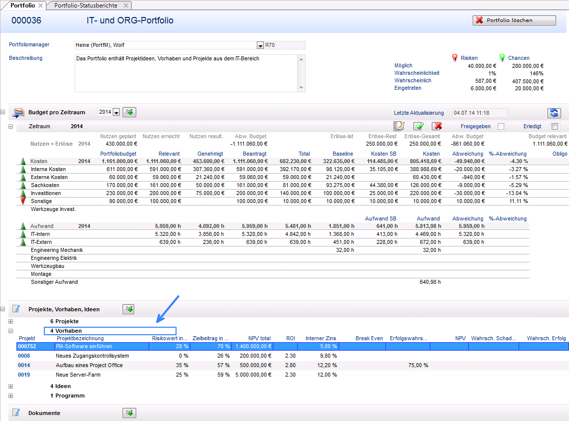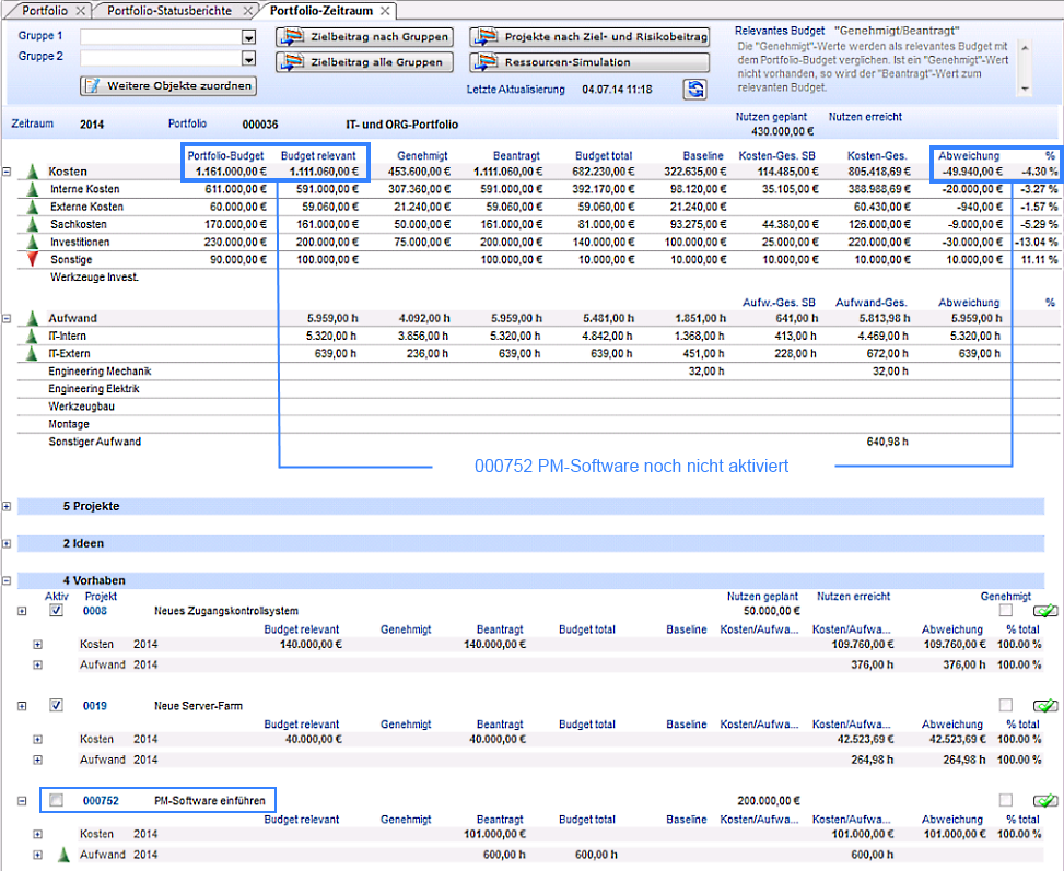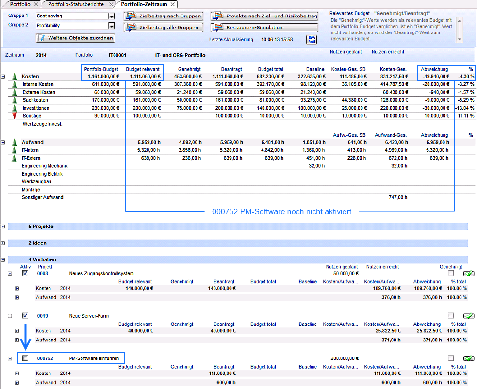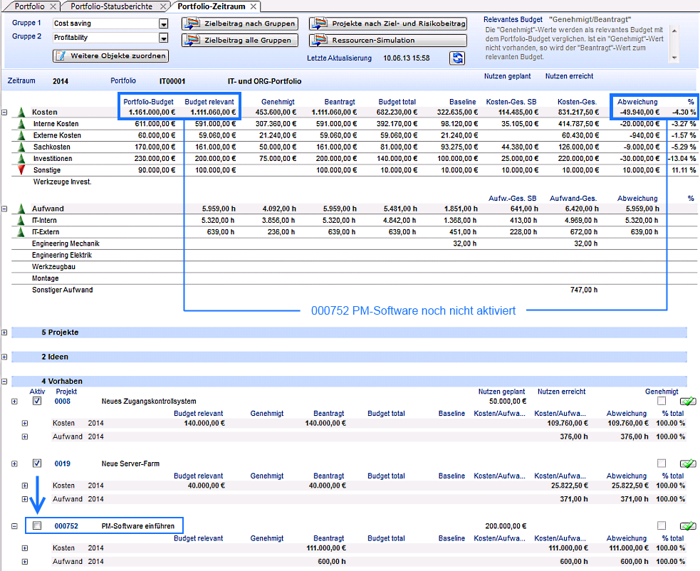 - Das Budget des Vorhabens 000752 PM-Software einführen ist jetzt im Portfolio berücksichtigt. (Checkbox Aktiv aktiviert)