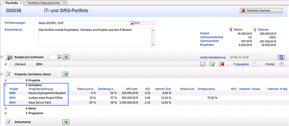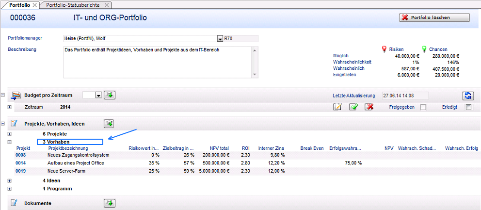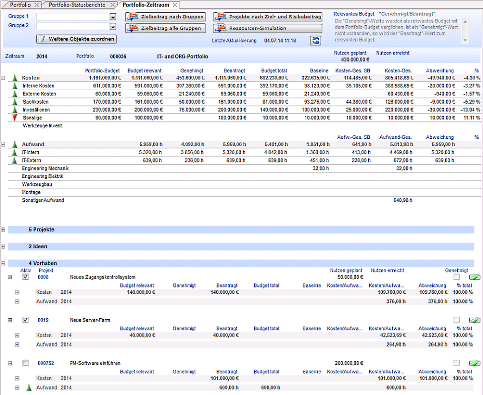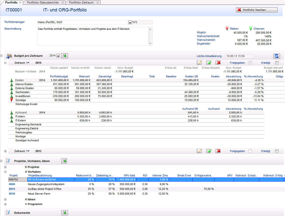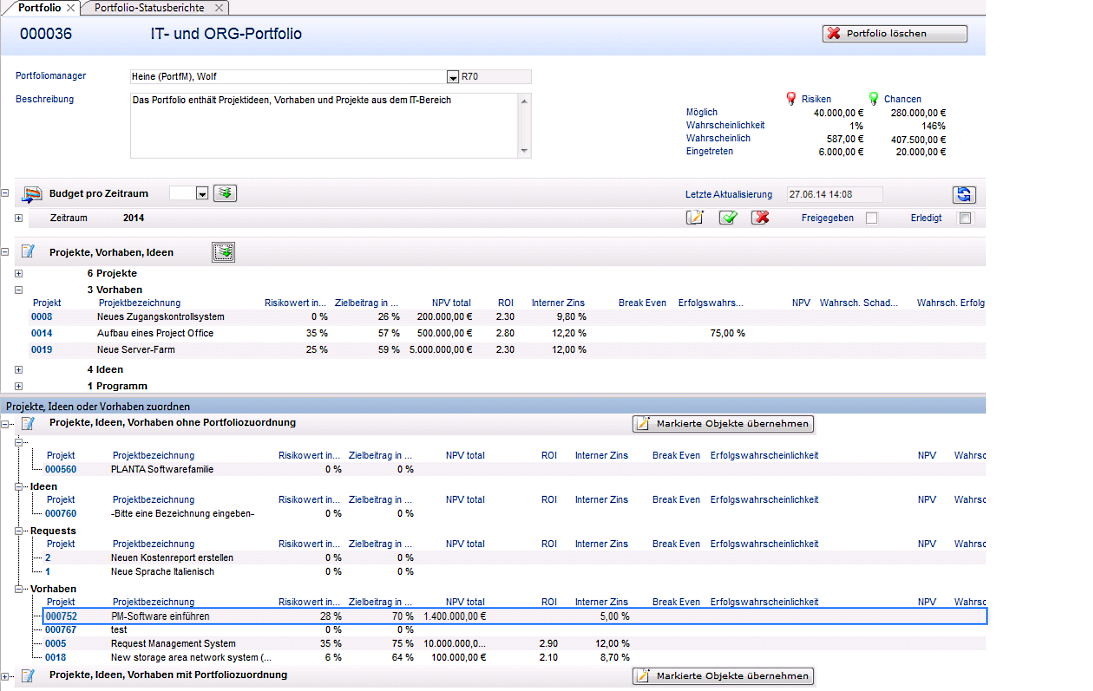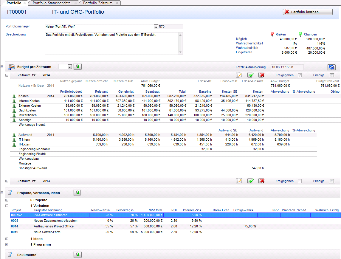 - Das Budget des Vorhabens 000752 PM-Software einführen ist jetzt im Portfolio berücksichtigt. (Checkbox Aktiv aktiviert)