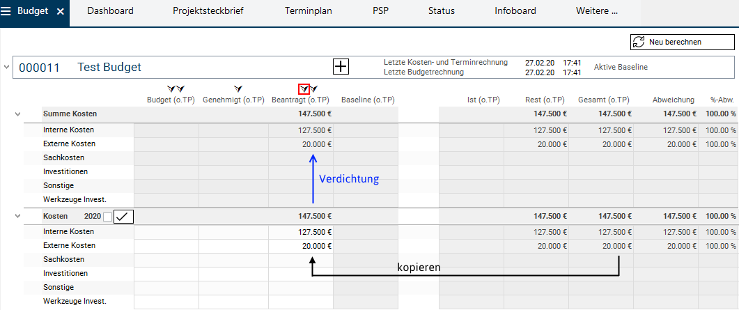 • Sobald die Teilprojekte budgetiert wurden (die Spalte Budget (o.TP) in den Teilprojekten gefüllt ist) und die Schaltfläche Neu berechnen betätigt wurde, werden die Budget-Werte verdichtet.