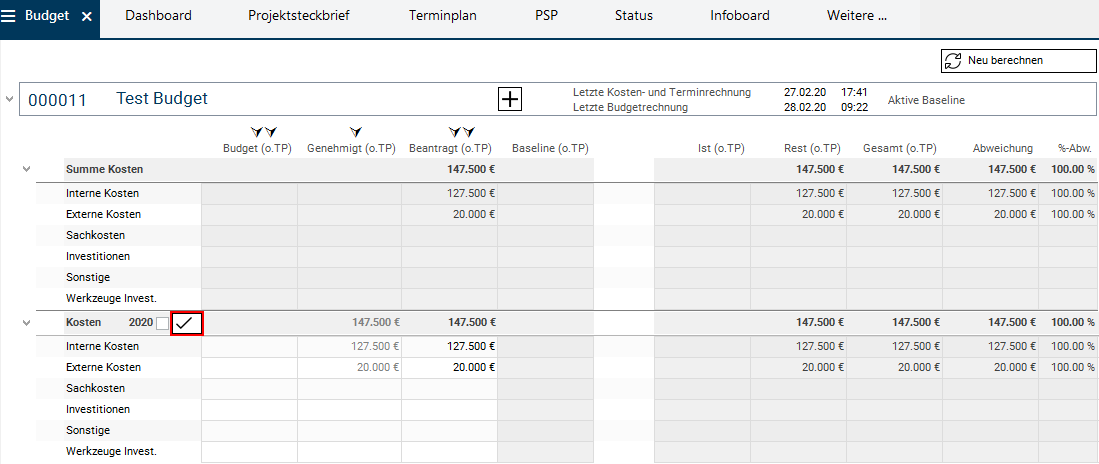 • Neben der Jahresscheiben-Überschrift Kosten 2020 betätigt der Multiprojektmanager den Haken. Damit genehmigt er das Budget dieser Jahresscheibe.
