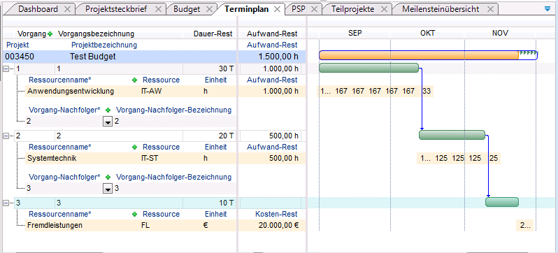 - Da das Hauptprojekt in diesem Fall kein eigenes Budget hat, sind die Werte in den Spalten Budget (TP) und Budget gleich.