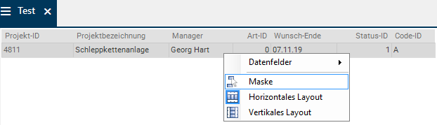 - Hat der zu bearbeitende Datenbereich ein horizontales oder ein vertikales Layout, das Layout durch Auswahl des Befehls Maske aus dem Kontextmenü oder über den Menüpunkt Maskeneditor Maske auf Maske ändern.