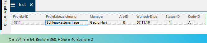 • Durch das Positionieren des Mauszeigers auf einem Element bzw. durch Markieren eines Elements werden in der Statuszeile dessen Koordinaten, Größe und Ebene angezeigt. Diese Informationen helfen z.B. die kleinsten Abweichungen in der Positionierung oder der Größe der Elemente zu erkennen, um diese ggf. zu korrigieren.