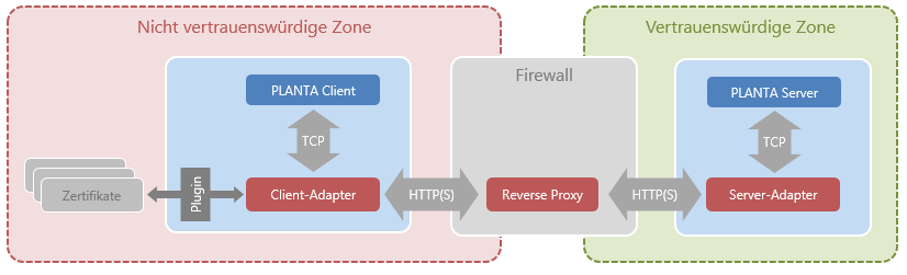 • Der Server-Adapter ist so zu konfigurieren, wie im entsprechenden Abschnitt weiter unten beschrieben, und muss in einem Server-Container bereitgestellt werden. Es wird eine direkte TCP-Verbindung zu einem bestehenden PLANTA-Server benötigt, und für einmalige Anmeldungen über Proxy zudem Authentifizierung, S 39.5.20 oder später mit einer kleinen Konfigurationsänderung.