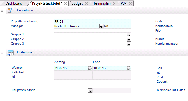 - Das Panel Projekt mit dem fokussierten Modul Projektsteckbrief wird geöffnet.