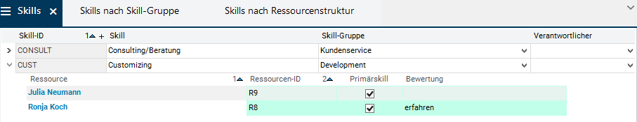 • Anschließend ist im Modul Skills ersichtlich, welchen Ressourcen der jeweilige Skill zugeordnet ist.