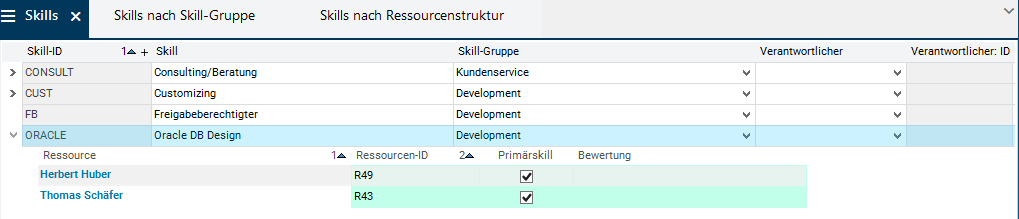 • Z. B. der Skill "Oracle DB Design" ist den Ressourcen R49 und R43 zugeordnet.