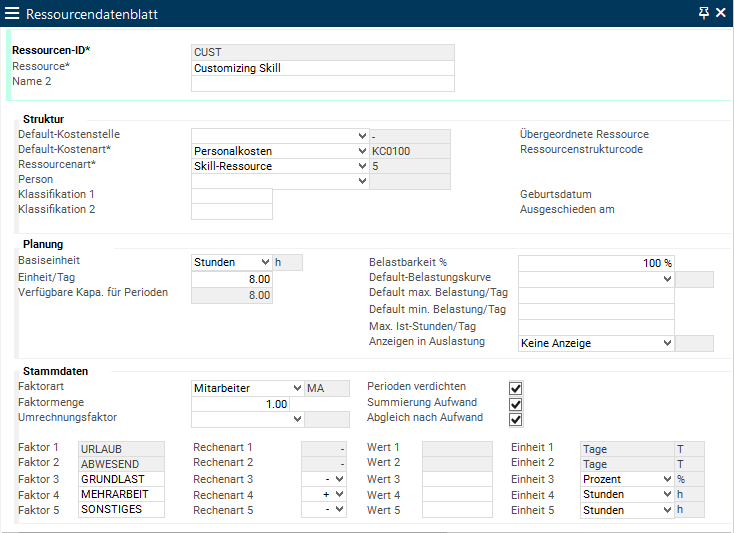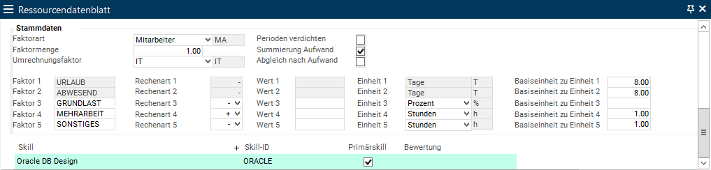 • Im Modul Ressourcendatenblatt wird zusätzlich eine gleichlautende Skill-Ressource erfasst, die keine eigene Verfügbarkeit hat, jedoch Perioden besitzt, damit darauf eingelastet werden kann.