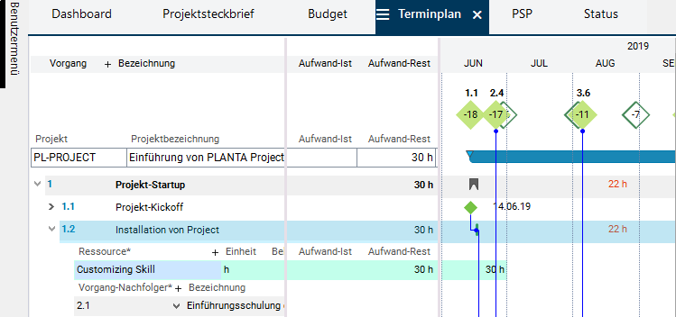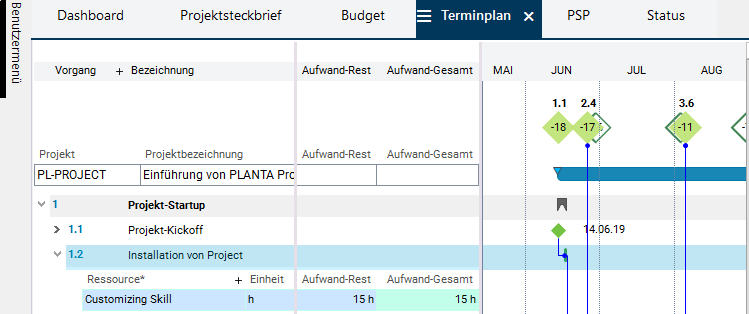 • Ist eine Skill-Ressource erfasst, kann sie im Modul Terminplan bei der Planung den gewünschten Vorgängen zugeordnet werden.
