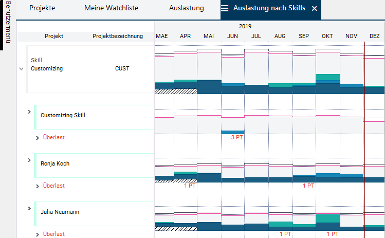 • Im Modul Auslastung nach Skills kann die Auslastung und Verfügbarkeit der Ressourcen nach den jeweiligen Skills eingesehen werden.