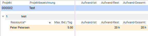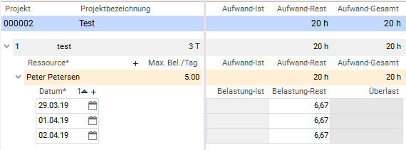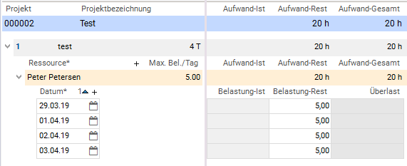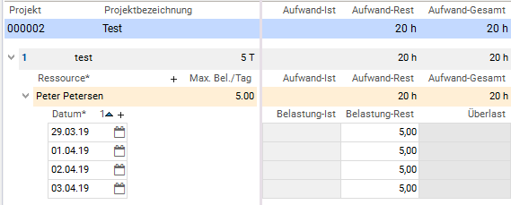 - pro Ressourcenzuordnung und Tag über die Dauer des Vorgangs und ein Belastungsdatensatz erzeugt wird.