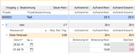 - Die Überlast-Werte sind fachlich nur aussagekräftig, wenn zuvor eine Neuplanung aller Planungsobjekte durchgeführt wurde (die Berechnung des Terminplans des betroffenen Planungsobjekts alleine ist nicht ausreichend), da diese bei der Einlastung der Ressourcen auch die Priorität der Planungsobjekte berücksichtigt.