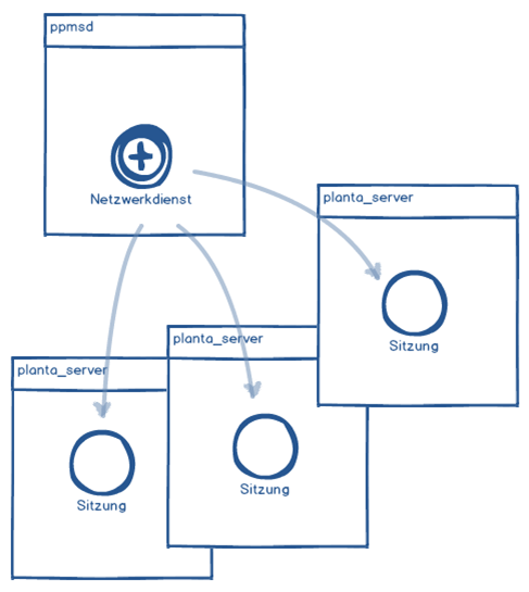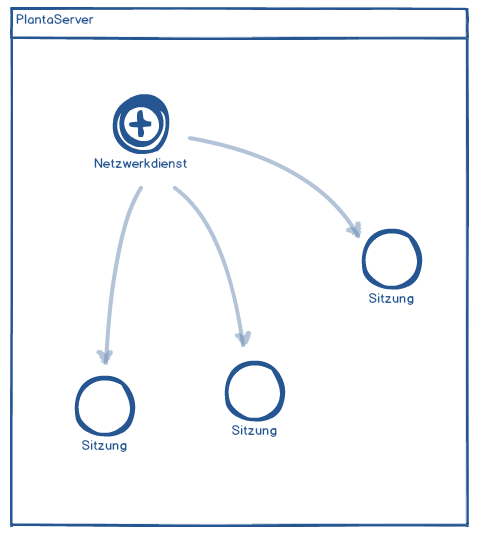 In der neuen Java-basierten, multithreaded Architektur wird jede Session (≙ Client-Verbindung), die zuvor in einem isolierten Prozess ablief, im Kontext eines Threads verarbeitet. Daher entsteht bei einer Client-Verbindung kein neuer Prozess mehr; einzig der in der JVM laufende PLANTA-Server-Prozess ist so von außen sichtbar. Daher gibt es nun keinen zusätzlichen Dienst mehr, der bei einer Client-Verbindung den Server startet; stattdessen ist der PLANTA-Server gleichbedeutend mit diesem Dienst ("PLANTA-Service"). Zusätzlich haben wir eine Datenbankschicht realisiert, über die zur besseren Ressourcenauslastung Verbindungen geteilt werden.