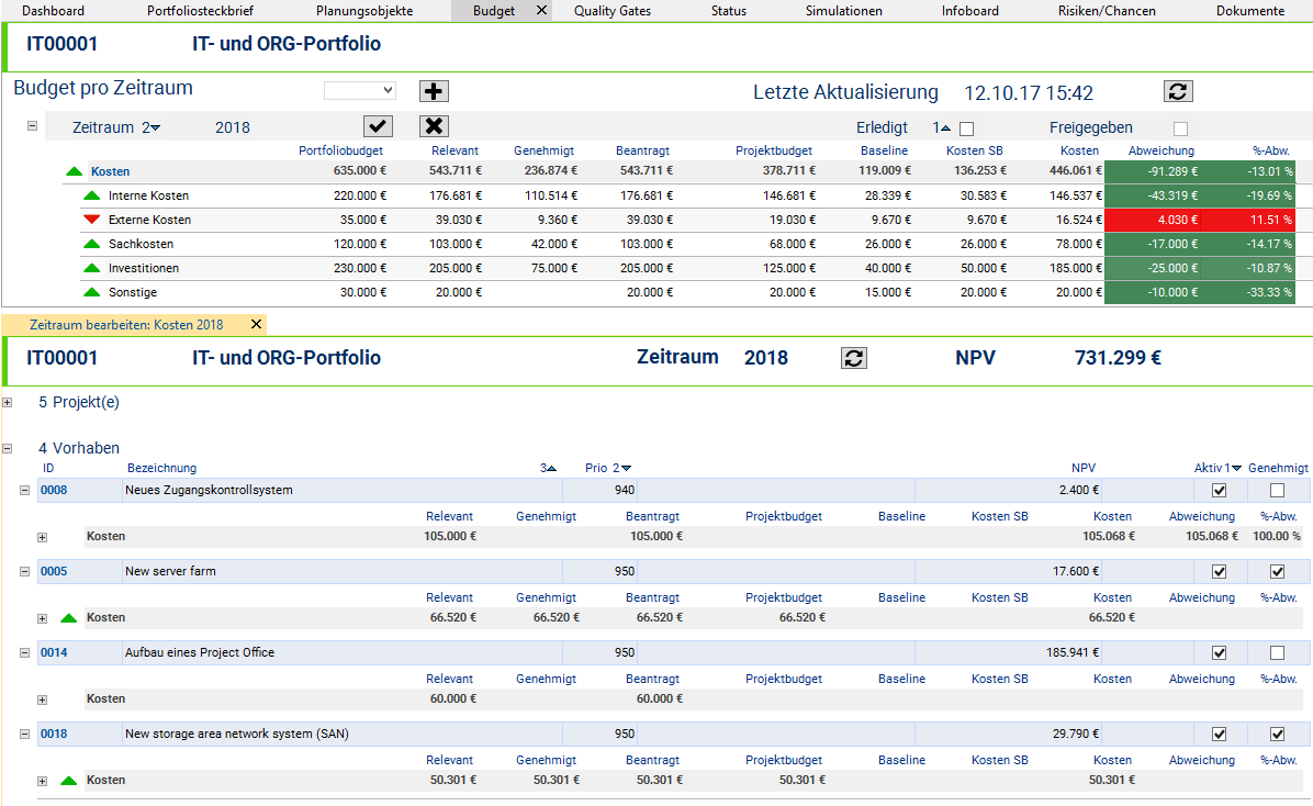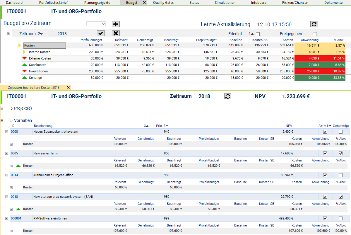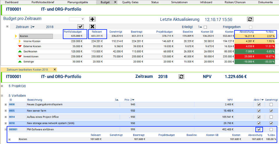 - Due to the color display of the planning objects by code, the portfolio manager immediately sees which planning objects cause the Overload. It is the new proposal the code color of which is “orange”.