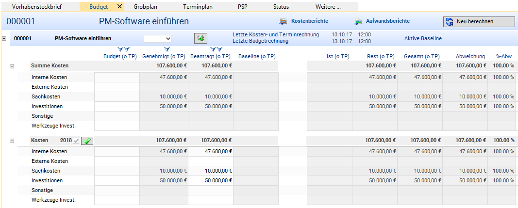 - Since the Panel of proposal 000001 Implement PM software has already been opened, the portfolio manager switches to the Budget module by clicking on the tab of the same name.