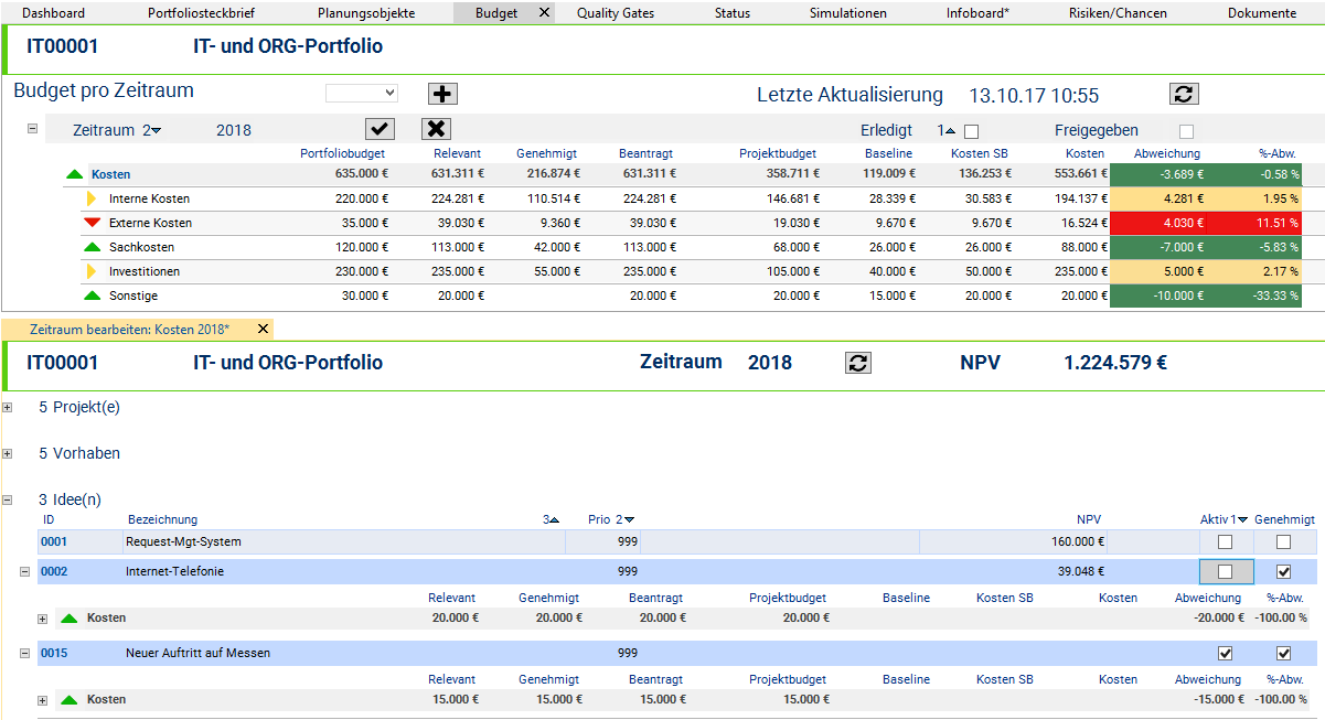 - In the Ideas area, she deactivates the Active checkbox of idea 0002. As a result, the budget reserved for idea 0002 is no longer considered in the portfolio, i.e. the Relevant budget is reduced