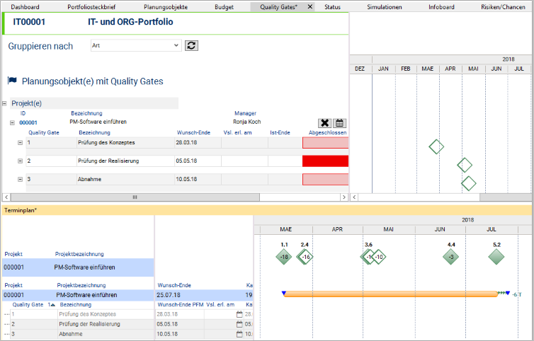 - The portfolio quality gates are inserted in the schedule of the project and are visible in the scale area.