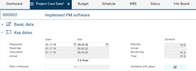 - According to the calculated dates of the project, the portfolio manager sets the dates for the quality gates in the Date field and carries out the schedule calculation in the Schedule module.