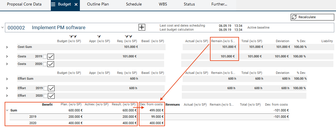 - Wera Heine clicks on the Recalculate button. The figures from the Costs 2019 yearly tranche are summarized to project total level.