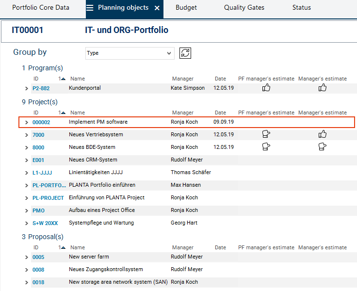 - In the Planning Objects module of the IT00001 IT- und ORG-Portfolio you can see that