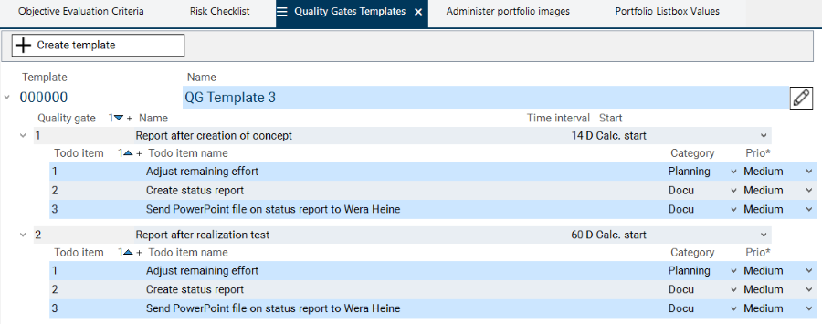 - The dates of the todo items correspond to the dates of the quality gates and are calculated when applying the template to a particular project. The portfolio manager can change them manually.