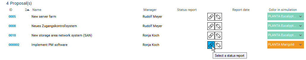 Select a status report button in the Status report selection area in the line of the Implement PM software proposal.