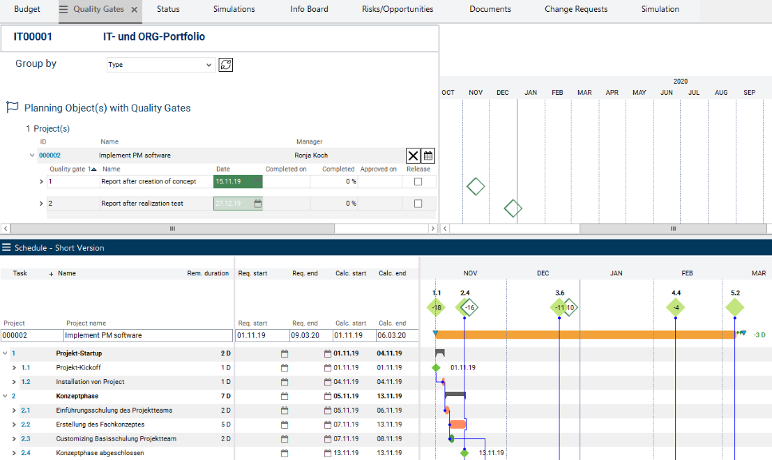 - The portfolio manager wants to adjust the quality gate dates set in the template by default to those of the project. For this purpose, she wants to check the schedule of the Implement PM software project.