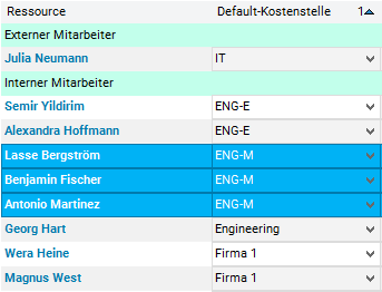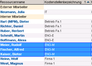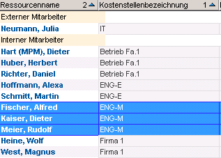 • Click on the sort arrow (pointing up for sorting in ascending order) in the heading of the Resource column. The column receives sort sequence 1, the Default cost center column receives sort sort sequence 2.