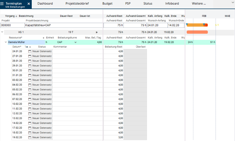 The project receives a requested end date. The remaining duration of the task is calculated according to the resource effort. Floats are exploited. The overloads are smoothed. End dates are adhered to as far as the remaining time horizon is sufficient for the planned duration of the task. |