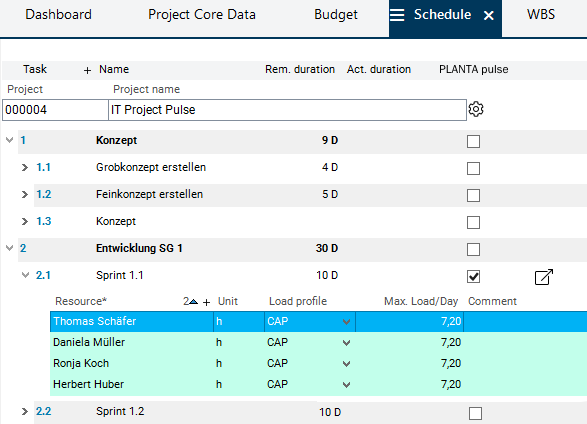 • Activate the PLANTA pulse checkbox in the record of the Sprint 1.1 task.